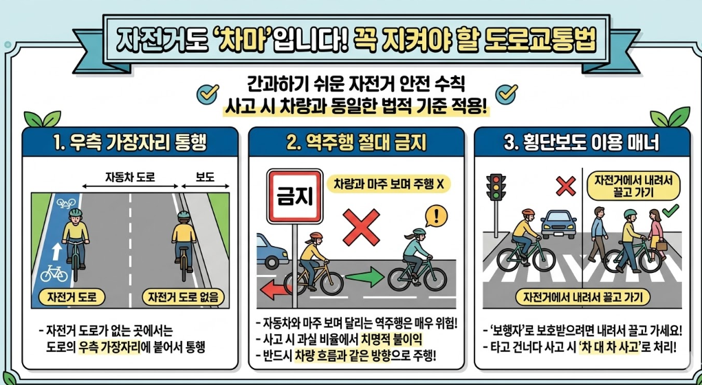 - 법적 지위: 자전거는 '차'이므로 도로 우측 통행과 교통법규 준수가 필수.