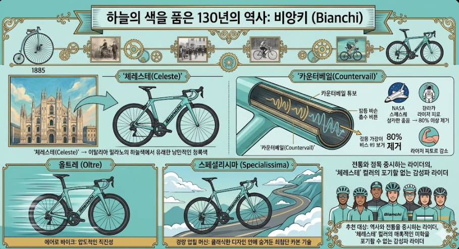 - 비앙키: 카운터베일 기술로 승차감을 극대화했으며, 체레스테 컬러의 압도적인 미학 보유.
