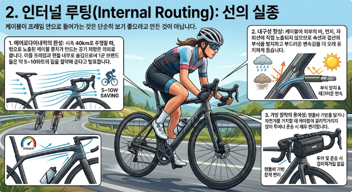 - 에어로다이내믹의 완성: 시속 40km로 주행할 때, 밖으로 노출된 케이블 뭉치가 만드는 공기 저항은 의외로 큽니다. 이를 프레임과 핸들 내부로 숨김으로써 1군 브랜드들은 약 5~10와트의 힘을 절약해 준다고 발표합니다.